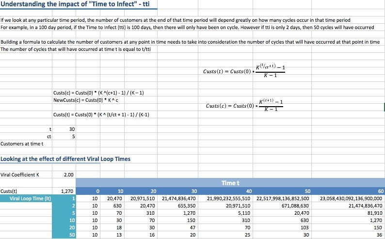 Looking at the table you will conclude, that a shorter duration of the cycle influences the viral growth amazingly. With a cycle duration 2 (days) in twenty days you’ll get 20 thousand and a half customers, but with a duration reduced to one day for a cycle this number of customers increasing to more than 20 million! That means the lessening of Viral Cycle Time influences the whole situation more than enlarging the Viral Coefficient number.