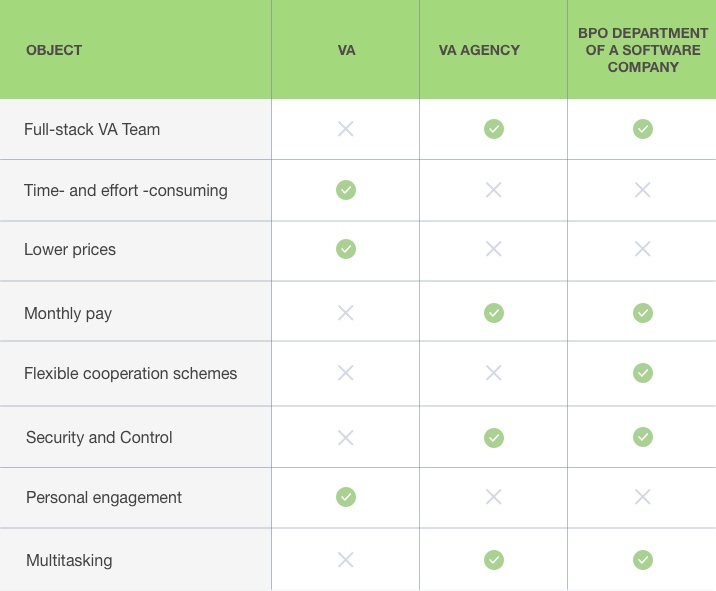 21 st century worldwide tech development goes hand in hand with a business boom as well as virtual assistant (VA) service being actively used by both experienced businesses and startups. On making up your mind to turn for certain virtual assistance, every businessman is bound to find themselves at the crossroads leading to a choice between a virtual assistant or a VA company. Actually, there always exists the third option concerning the issue: BPO Department of a software company. Feel at a loss? No worries, a short insight into the topic will definitely clear all the issues up.