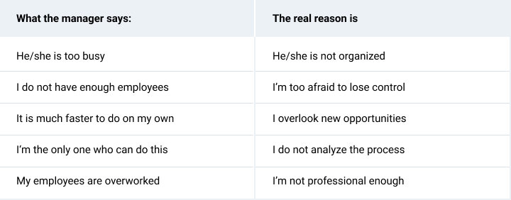 Though many studies show that managers that possess the crucial skill of delegating excel their colleagues in total revenue, boosting the company’s morale and productivity. The reasons the manager fails to delegate might be different from what he or she says: